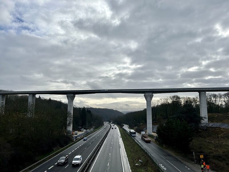 What sets it apart immediately is that almost the entire stretch runs above ground, carried by a viaduct close to seven kilometers long. This structure is the longest rail viaduct in France.